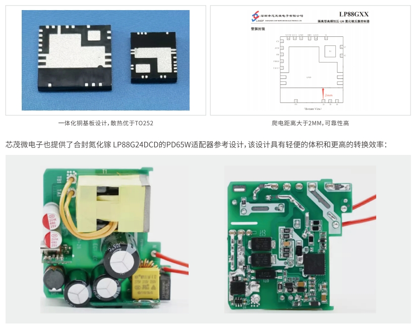 在這一背景下,芯茂微電子憑借其在電源管理芯片領域的深厚技術積累和創新能力,推出了合封氮化鎵LP88G24DCD的PD65W適配器參考設計。這一設計充分展現了GaN技術的優勢,同時也體現了芯茂微電子在電源管理芯片設計上的先進理念。