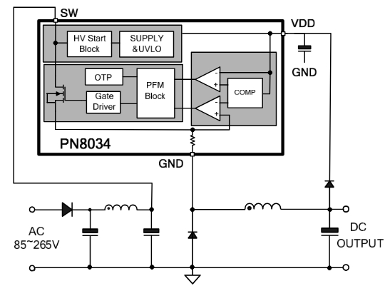 PN8034內(nèi)置高壓?jiǎn)?dòng)模塊,能夠?qū)崿F(xiàn)系統(tǒng)快速啟動(dòng)和超低待機(jī)功耗,待機(jī)功耗低于100mW。