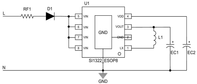 SI1322 的典型應(yīng)用電路簡潔明了,易于理解和實(shí)現(xiàn)。