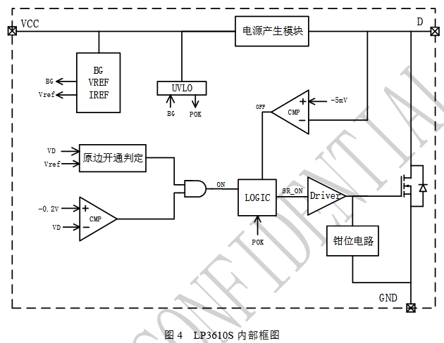 LP3610S 是一款專為開關電源設計的高性能同步整流芯片,它內置了耐壓高達 45V 的功率管,能夠兼容 DCM(不連續導通模式)和 CCM(連續導通模式)等多種工作模式。這款芯片采用了專利的整流管開通技術,有效避免了因激磁振蕩引起的誤開通現象,從而顯著提高了電源系統的穩定性和可靠性。同時,LP3610S 還集成了 VCC 供電技術,確保芯片在各種工作狀態下都能獲得穩定的供電,進一步增強了系統的穩定性。LP3610S內部框架圖如下所示~