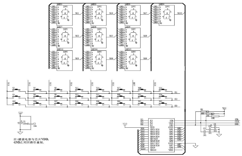 顯示驅動電路:包括SEG1-SEG10和GR1-GR8引腳,用于驅動LED顯示屏。SEG引腳為段輸出,GR引腳為位輸出。