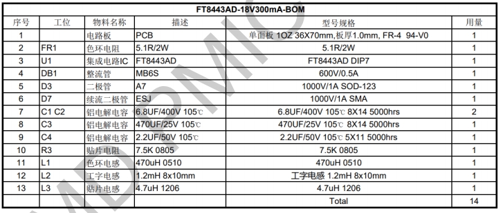 以下是該18V300mA電磁爐電源方案的主要物料清單: