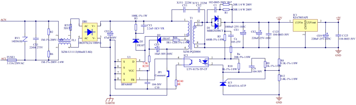 在主電路部分,BPA861AP芯片通過集成的高壓MOSFET實現開關功能,將輸入的交流電轉換為高頻脈沖信號,再經過變壓器進行隔離和降壓,最終通過整流濾波電路輸出穩(wěn)定的12V直流電壓。光耦和TL431組成的反饋電路能夠實時監(jiān)測輸出電壓的變化,并將反饋信號傳遞給BPA861AP芯片,從而實現對輸出電壓的精確調節(jié)。