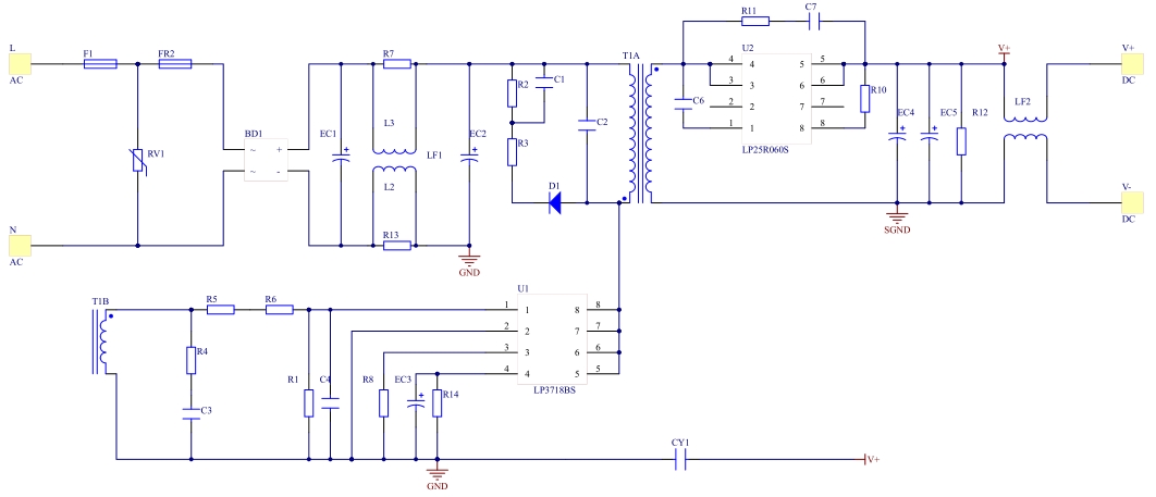 | 1 | U1 | LP3718BS | SOP-8 PWM控制器 | 1 |