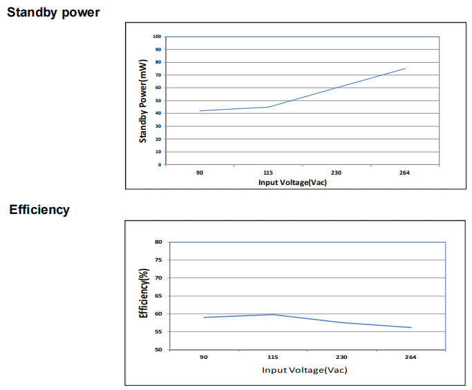 5 V/100 mA:η = 59 %(115 VAC),待機 62 mW