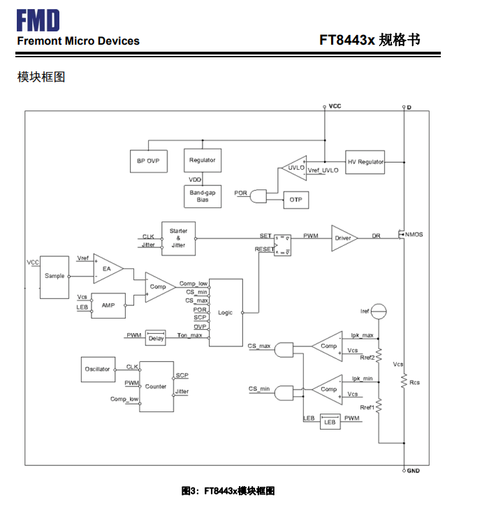 FT8443x是一款高性能、高精度、低成本的非隔離PWM功率開關。它包含一個專門的電流模PWM控制器和一個高壓功率開關管。內置的誤差放大器經過優化保證優越的動態響應。高精度的內部分壓電阻和參考電壓,以及穩定的閉環反饋使得FT8443x在全電壓輸入范圍內都能得到穩定的高精度輸出電壓。