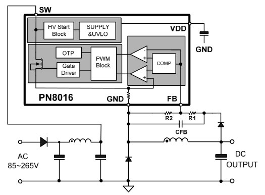 PN8016SSC-R1B集成PFM控制器及800V高雪崩能力智能功率MOSFET,用于外部元器件極精簡的小功率非隔離開關(guān)電源,輸出電壓可通過FB電阻調(diào)整。PN8016內(nèi)置800V高壓啟動與自供電模塊,實現(xiàn)系統(tǒng)快速啟動、超低待機、自供電功能。該芯片提供了完整的智能化保護功能,包括過載保護,欠壓保護,過溫保護。另外PN8016的降頻調(diào)制技術(shù)有助于改善EMI特性。