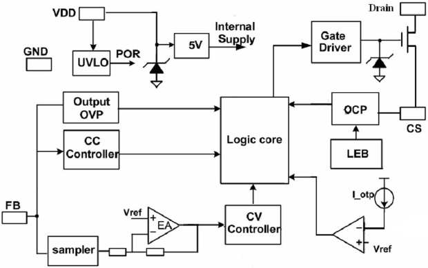 PL3325CD 是一系列高效率、高集成度、原邊調(diào)節(jié)的 PWM功率開關(guān),其主要應(yīng)用于小于 12W 的 AC/DC 反激式開關(guān)電源。PL3325C 通過去除光耦以及次級控制電路,簡化了充電器/適配器等傳統(tǒng)的恒流/恒壓的設(shè)計,從而實現(xiàn)高精度的電壓和電流調(diào)節(jié),內(nèi)部框架圖如下所示