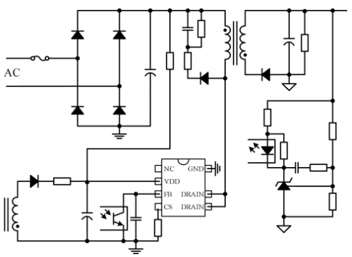 芯片通過(guò)對(duì)輸出采樣并反饋到光耦獲得高精度的恒壓輸出。內(nèi)置的斜率補(bǔ)償電路確保了峰值電流??刂频姆€(wěn)定性。內(nèi)部集成的頻率抖動(dòng)功能可以改善EMC,降低EMI濾波成本。