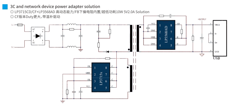 在3C(計算機、通信和消費電子)設備和網絡設備的電源適配器領域,10W的輸出功率是一個常見的需求點。為了滿足這一需求,LP3715系列提供了多種解決方案,這些方案不僅能夠提供穩定的電源輸出,還能根據不同的應用場景提供定制化的功能。本文將詳細介紹LP3715系列在10W電源適配器中的應用,包括其技術規格、特點以及推薦的應用場景。