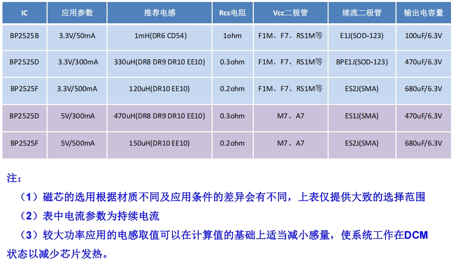 BP2525X芯片適用于多種應(yīng)用場(chǎng)景,如3.3V/300mA和5V/300mA的WiFi應(yīng)用。推薦電感、Rcs電阻、Vcc二極管、續(xù)流二極管和輸出電容的具體參數(shù),以及在不同負(fù)載下的待機(jī)功耗和滿載效率數(shù)據(jù),為設(shè)計(jì)者提供了寶貴的參考信息。