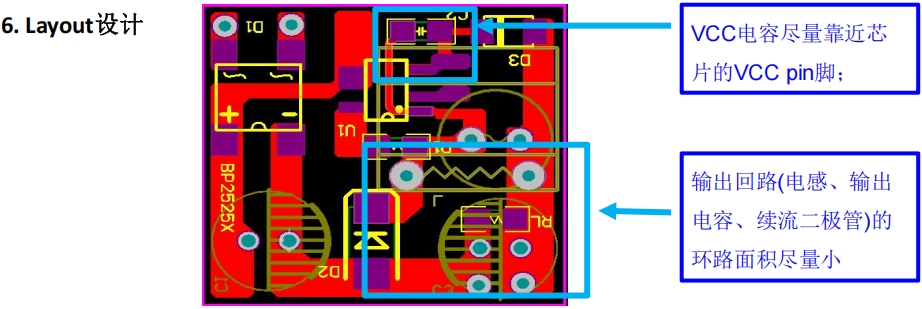 Layout設(shè)計(jì):VCC電容應(yīng)盡量靠近芯片的VCC pin腳,輸出回路的環(huán)路面積應(yīng)盡量小,以減少電磁干擾。